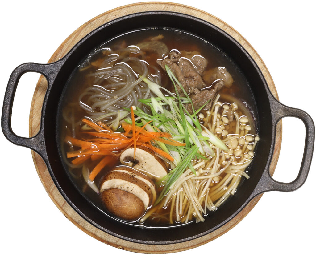 Spicy beef broth with beef, vegetables, mushroom, egg, and sweet potato noodles. Served with rice.