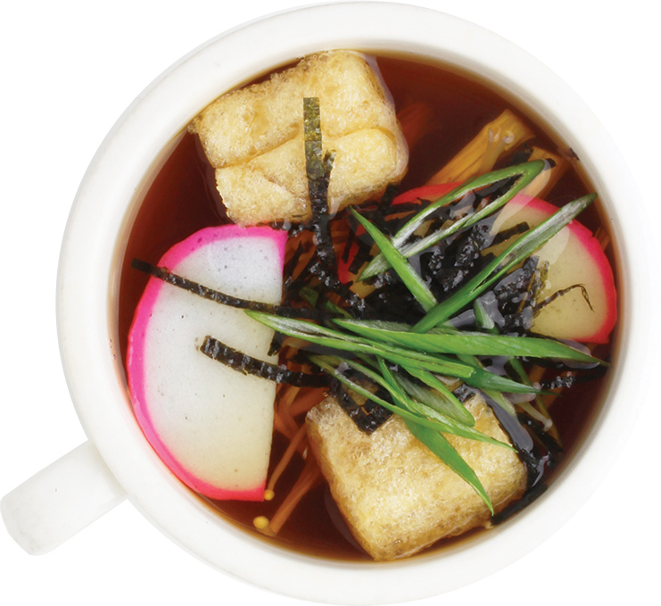Vegetable broth with seaweed, enoki mushroom, fishcake, dried tofu, and green onion.