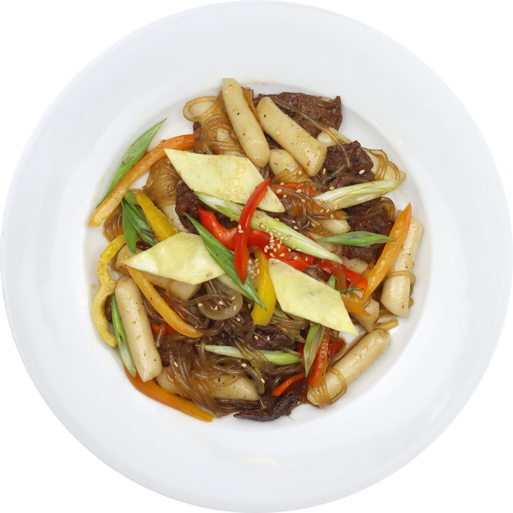 A traditional version of tteokbokki that is mildly flavored with a soy sauce base, mixed with veggies, glass noodles, and egg (No side dish).